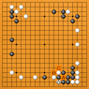 白△とアテたところです。次の一手を、A~Cの選択肢の中から示してください。