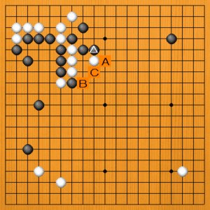 黒△と押したところです。次の一手を、A~Cの選択肢の中から示してください。