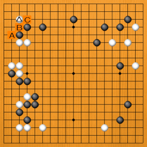 白△と三々に入ったところです。次の一手を、A~Cの選択肢の中から示してください。