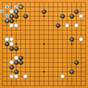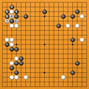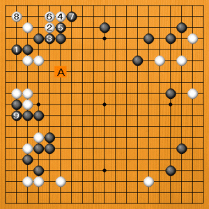 黒1(B)のグズミは、白のワタリを防ぎながら、隅の地も頑張ろうと言う欲張った手です。隅の白は生きる筋が残っています。白2のコスミから4とカケツいで、生きるのは簡単です。ただし、黒7の突き抜きが来ると、左辺の白が弱くなります。ですから、隅の白はすぐには生きてきません。