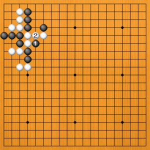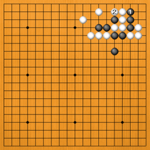 黒1の方をオサえても、白2とマゲて逃げられます。いずれにしても、打開策にはなりません。