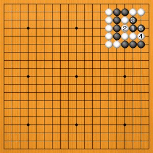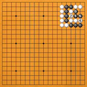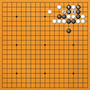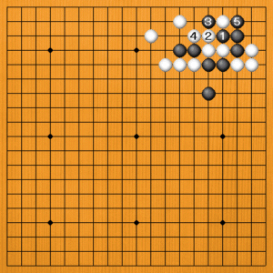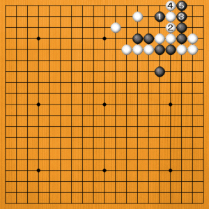 黒1(A)のアタリは、白2と要石を逃げられて捕まりません。黒3から5と、こっちを取ってもつまらないのです。