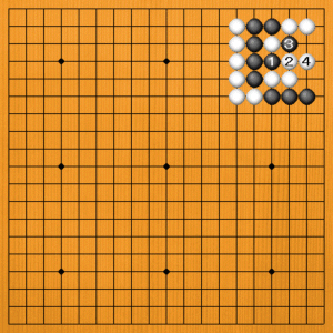 黒1とアテるのは失敗です。直接アタリにするのは、だいたい手筋にはなりません。白2に黒3と取りますが、白4とサガるのがうまい手で、黒は攻め合いに勝てません。