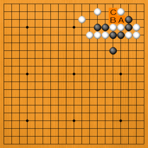 要石はどれでしょう。際どい攻め合いを解決してください。次の一手を、A~Cの選択肢の中から示してください。