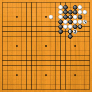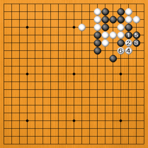 白1と逃げてくれば、そこで黒2とツギます。白3のアタリには、黒4と逃げる手がアタリになっていますから、白5の逃げに、黒6と切って白三子が取れます。