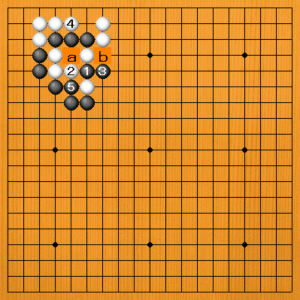 黒1に白2とこっちからアテてくれば、黒3と逃げていいのです。aとbが見合いで、白の要石を逃がしません。白4と隅からダメを詰めてくれば、黒5とアテて白三子が取れています。