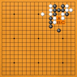 黒石がピンチです。助け出す手筋を発見できるでしょうか。次の一手を、A~Cの選択肢の中から示してください。