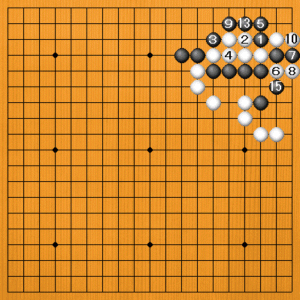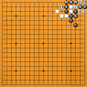 黒1には白2とこちらからアテてくるでしょう。ここで黒3と一つアテるのが手順です。それから黒5とサガれば筋に入っています。白6のカカエに、黒7とサガって二子にして捨てます。黒9からシボるのですが、黒11のホウリコミを忘れてはいけません。白14とツガせてダメを詰めてから、黒15で白の塊が取れています。