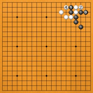 黒1のオサエが成立します。しかし、白2とマゲられた後が肝心です。黒3とサガったのでは、白4とコスミツけられて、攻め合いに負けてしまいます。