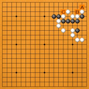 複雑な形です。黒の起死回生の手筋はどこでしょう。次の一手を、A~Cの選択肢の中から示してください。