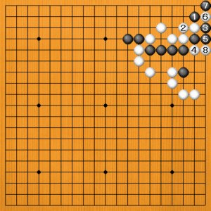 黒1(C)のアテは、白2とツガれて筋を消してしまいます。それから黒3と切っても、白4とカカえられて、黒の息が切れてしまいます。黒5から7とシボっても、白8とツガれてそれまでです。
