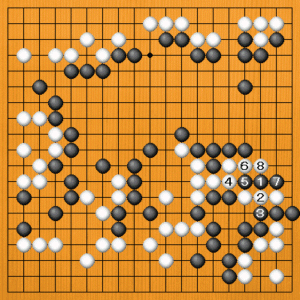 白1の出には、黒2とオサえることができるのです。白3と切られても、黒4のトビが手筋で、攻め合いに勝つことができます。白5の出から7とアテられても、黒8のツギまで、白四子が取れています。
