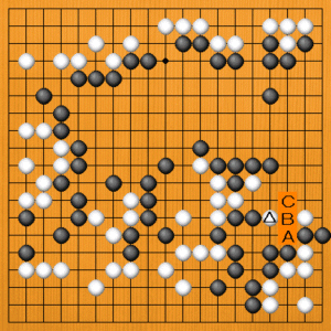 白△のツケが決め手になりそうですが、黒からうまい受け手があります。次の一手を、A~Cの選択肢の中から示してください。