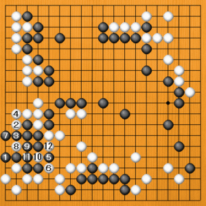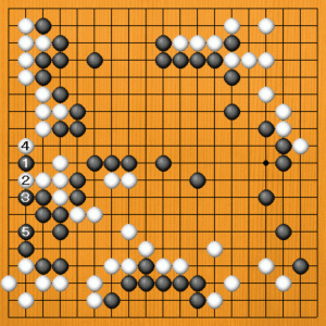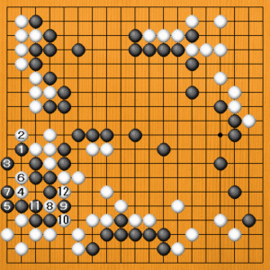 | 自分が生きなければならないときに、敵陣に置く手筋を発見するのは難しいものです。生きるか死ぬかで勝敗が決まる大変な場面でした。 |