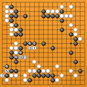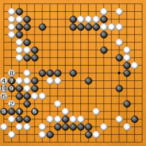 白1から黒模様を削減するヨセを打っているように見えますが、黒4まで換わってから白5、7と黒一子を取ったのには狙いがあります。黒8に白9とハネて分断したあとがテーマです。