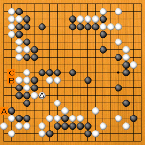 白△とノビたところです。分断された黒に生きる筋はあるでしょうか。次の一手を、A~Cの選択肢の中から示してください。