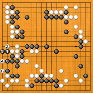 黒1(B)のハネもうまくいきません。白2のオサエに黒3とサガりますが、白4の置きが急所です。黒5と断点を補えば、白6とワタって黒の眼がありません。