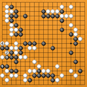 黒1とサガれば、白2と切って黒二子を取ります。黒3とアテても、白4で黒二子が助かりません。