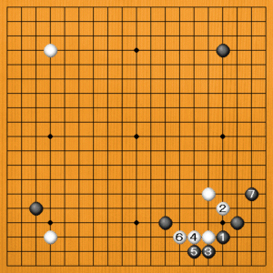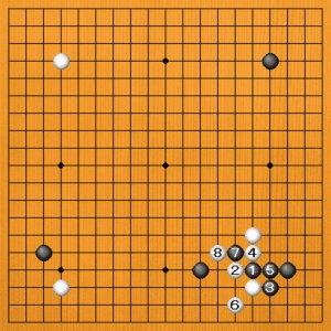 黒3と下をハネるのも有力です。白4とノビれば、黒5のハイも決めて7とスベります。こうなれば隅がいい地ですから、黒に不満はありません。 白4で、(次の図へ) |