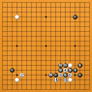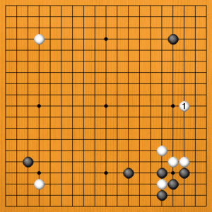 白1と右辺に展開するくらいです。白が戦いを避ければ、黒に不利な形にはなりません。 |