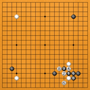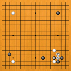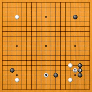 黒1には白2とコスむのが有力です。黒3のハネは白4と切られてまずいですから、黒も変化が必要です。 |