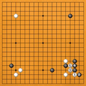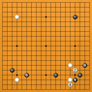 白1とオサえれば、黒2とアテます。白3の切りには、黒4とツグことができます。白5と動き出すのは無理ですから、これは黒がいいでしょう。 白3は保留して、(次の図へ) |
