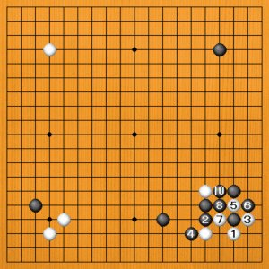 黒2のブツカリが形です。白3のハネには、黒4とオサえます。白5とカカえて、黒6の切りから10とツイで一段落です。これは互角の変化です。一時期よく打たれていました。 |
