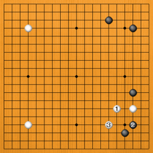 白1に黒2と隅を守れば、白3のケイマが好形です。白石がゆったり外側を占めて、感じのいい展開でしょう。 |