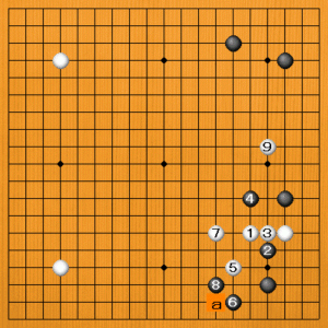 黒2のノゾキを決めて4とトブ打ち方もありますが、白5のケイマがいいところです。黒6とスベるくらいですが、白7と整形すれば下辺と右辺が見合いになります。白aのツケを防いで黒8とコスめば、白9と右辺にトビ込むのがいいところです。 白1は有力な打ち方です。ぜひ試してみてください。 |
