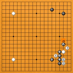 白1(A)のケイマは悪手です。黒2の受けに白3とツケるつもりなのですが、今度は黒4と出られて白が困っています。白5のハイから7とコスんでも、黒8の出がぴったりです。黒△がaにあるのとは大違いなのです。 |