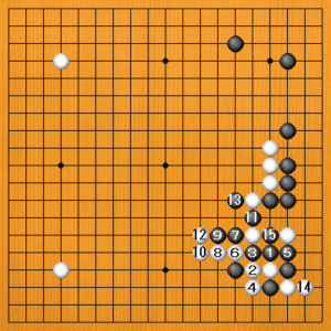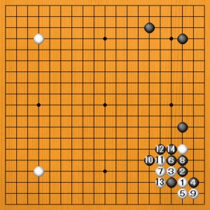 黒1とアテる変化があります。白2の出に黒3とアテて5とツグのですが、白6と切って、白に悪いことはありません。黒7のアテから11とカカえますが、白12のマゲが決め手で下辺を広げます。さらに、白14のサガリも利くのが堪りません。右辺の白は捨て石です。白地が大きくて、白有望です。 |