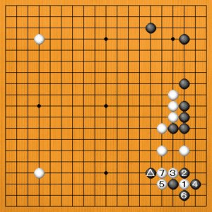 白1のツケが鋭い追及です。黒2とハネ出されてまずそうですが、白3と切り違える手筋が有効です。黒4と隅にアテてくれば、白5の外アテから7といツイで、黒△の一子を切り離します。白の大成功でしょう。 黒4で、(次の図へ) |
