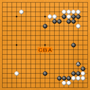 黒△とカケツいだところです。黒模様にどこまで踏み込みますか。次の一手を、A~Cの選択肢の中から示してください。 |