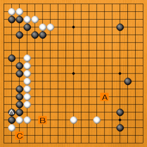黒△とツイだところです。形勢は白が厚くて優勢と思われます。白模様を大事にして、優勢を維持したい場面です。次の一手を、A~Cの選択肢の中から示してください。 |