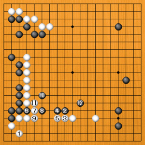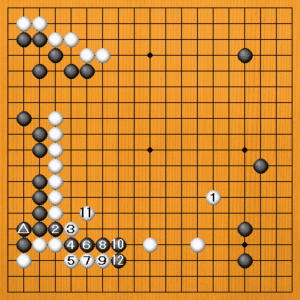 白1(A)と広げるのは素直な発想ですが、この場合は失敗です。左下の白には弱点が残っています。黒2の出から4と切られると、隅の白が弱くなります。白5と下からアテて7、9とハエば生きることは出来ますが、黒10のノビには白11と断点を補わなければなりません。黒12のオサエがいいところです。白模様の中で堂々と暴れて来るでしょう。弱点を残すのは、根こそぎ荒らされる危険性があるのです。 |