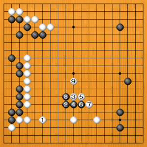 白1に黒2と深く打ち込んでくれば、白3とコスんで取りに行きます。黒は左側に逃げても白の壁に阻まれますから、うまいサバキは望めません。 |