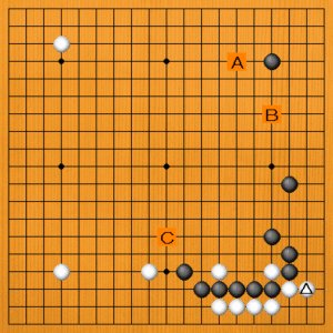 白△とサガったところです。黒が厚くてやや優勢と思われます。次の一手を、A~Cの選択肢の中から示してください。 |