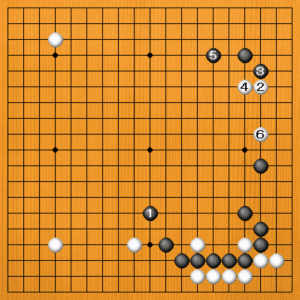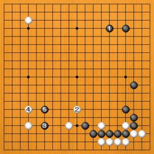 白2は好点ですが、右下の黒は強靭な石ですからびくともしません。黒3と強気で打ち込んで行くのが有力です。白4に黒5とトンで分断すれば、白2とケイマした石が弱くなります。厚みを攻めに活用して、黒が好調です。 |