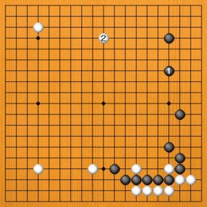 黒1(B)は模様をしっかりさせようという手ですが、右辺が平坦で盛り上がりに欠ける印象です。隅も白2の三々に入られれば簡単に荒らされてしまいます。これも失敗でした。 |
