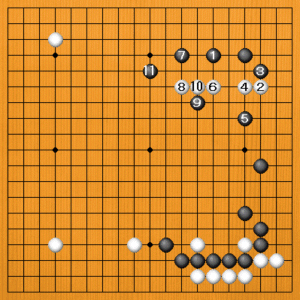 黒1(A)と上辺に向かってシマるのが正解です。模様が立体的になって、将来が楽しみです。白2と入ってくれば、黒3のコスミツケから5と詰めて攻めるのが有力です。白6とトンで逃げるのが精いっぱいでしょう。黒11まで、攻めながら黒地が増える理想的な展開です。 |