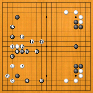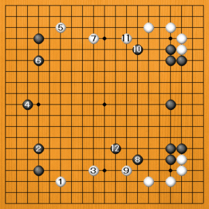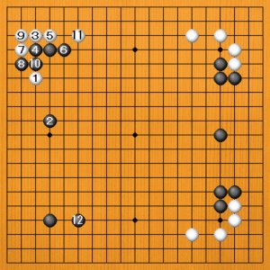 白1には、黒2とハサむのが好手です。白はいろいろな打ち方がありますが、分かりやすいのは白3の三々でしょう。黒4と遮って、白11のトビまでが定石ですが、続いて黒12とシマるのが好点です。左辺の黒模様がいい形です。右辺とも連動してきそうです。白としては歓迎できない展開です。 |