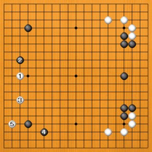 黒2の詰めには、白3と二間にヒラくのも分かりやすい打ち方です。黒4のケイマに白5とスベって安定します。 |