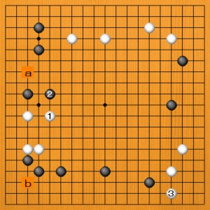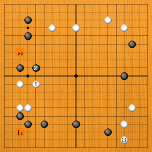 (正解) 白1(B)のトビが100点の好手です。白番では弱い石を作らないことが大切なのです。この石をしっかりさせてから、後に白aやbの打ち込みを狙います。もし、黒2とトンで守ってくれば、この交換だけで満足して、白3など他の大場に向かうのがいいでしょう。 |
