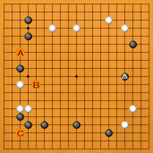 黒△とヒラいたところです。次の一手を、A~Cの選択肢の中から示してください。 |