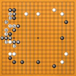 白1(A)の打ち込みは無理気味です。40点と大幅な原点です。黒2のコスミで外側から封じ込められると中で生きることになります。白3のノゾキから手順を尽くして白15まで生きることはできますが、外側の黒が厚くなっています。黒16のハネが厳しく追及されるでしょう。白17のハネに黒18とノビて、黒が攻勢に立ちます。こっちの白はまだ眼がありませんから、相当攻められることを覚悟しなければなりません。白1から黒陣で生きましたが、黒16から反撃されて、得にはならないのです。 |