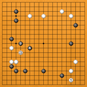 左辺を放っておいて、単に白1と大場を打つのは、黒2のケイマが厳しい手になります。白3と受けても、黒4とさらに煽ってくるでしょう。黒は攻めながら自陣を固めて、理想的な展開です。弱い石を作ると、一気に追い込まれることがありますから、注意しましょう。 |
