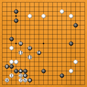 | 白番では弱い石を作らないようにしましょう。自陣をしっかりさせて、後に反撃を試みるのがいいのです。 |