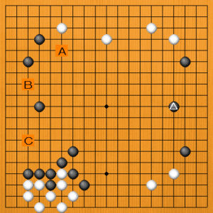 黒△とヒラいたところです。次の一手を、A~Cの選択肢の中から示してください。 |