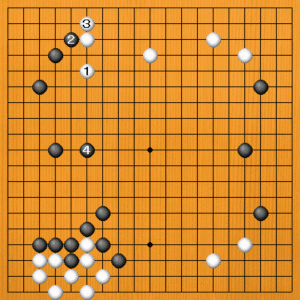 白1(A)のトビは好点ですが、やや減点の80点です。黒2のコスミツケから、黒4のトビに回られてしまいます。ここが好点なのです。左辺は白から入りにくくなっています。このまま相当な黒地になりそうです。 |