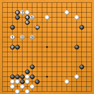 白1(B)の打ち込みは70点です。黒2のサガリには白3とトンで逃げるくらいですが、ここで黒4とツケるのがいい調子です。白5のハネには黒6とノビて、上下の白を割いていきます。白9のトビには、黒10のケイマが好点で、上下の白に圧力を掛けています。モタレ攻めの様相です。 |